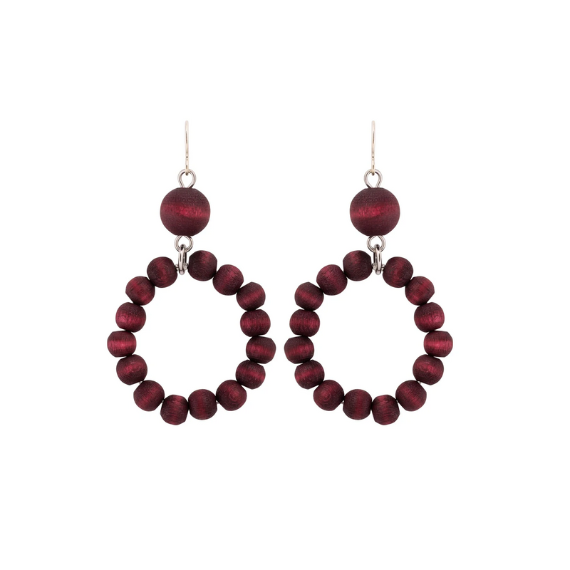Hand-dyed, wooden Orvokki earrings have small wooden beads forming a hoop. The beaded hoop hangs from a large wooden bead. The earrings are light to wear and combine beautifully with other collections and materials.