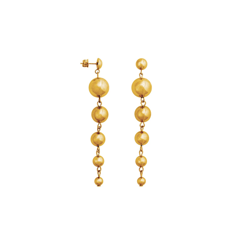 Hand-dyed Sandra earrings consists of a hemisphere with 5 metal pearls of different sizes, hanging from it. The lively earrings are light to wear. Combine boldly with different collections and colours.