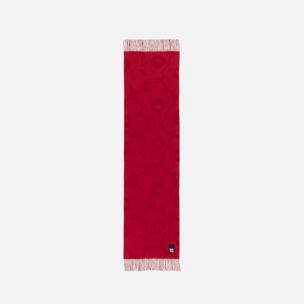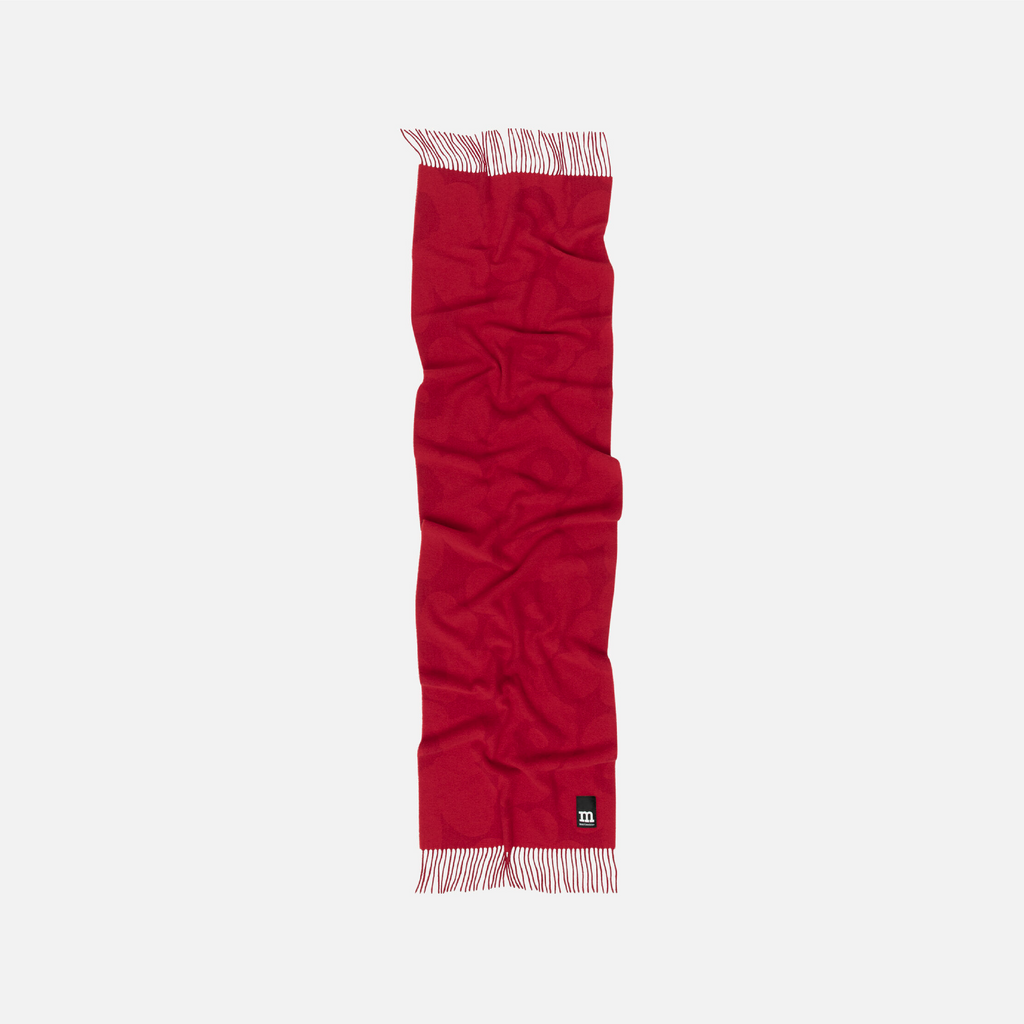 The Identtinen scarf is made of a wool blend in the Unikko pattern. The long scarf has fringes at the ends and it features the Marimekko label.