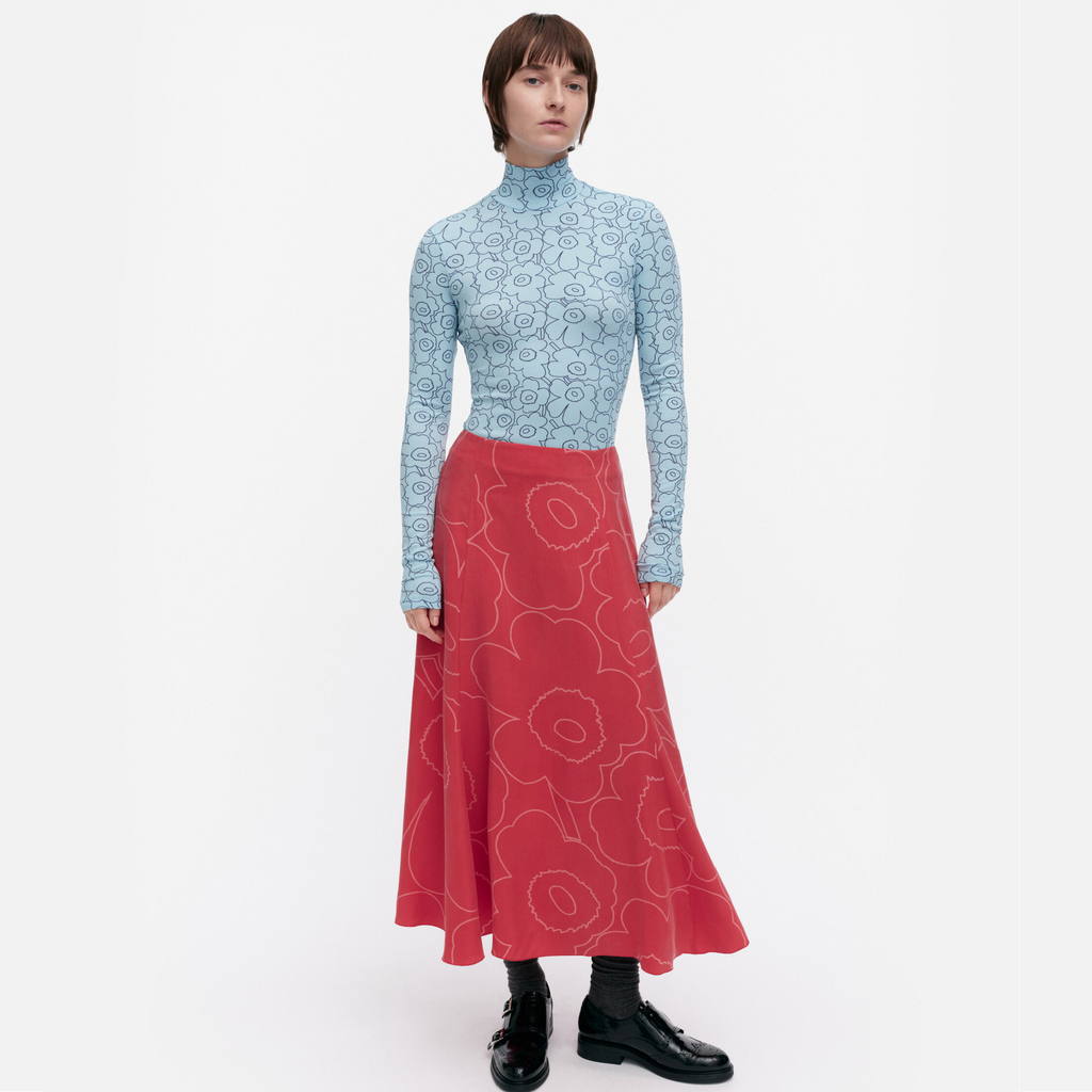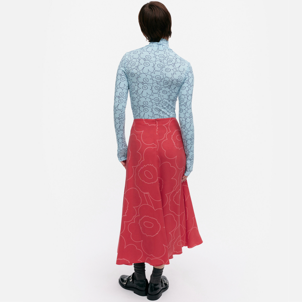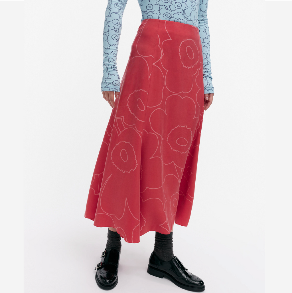 The Muovaus skirt is made of a lyocell and viscose blend, and it has a slim fit, a straight top, and a flared cut hem. The skirt features the Piirto Unikko pattern and a concealed zipper in the back seam. The hem is finished with a narrow rolled hem.