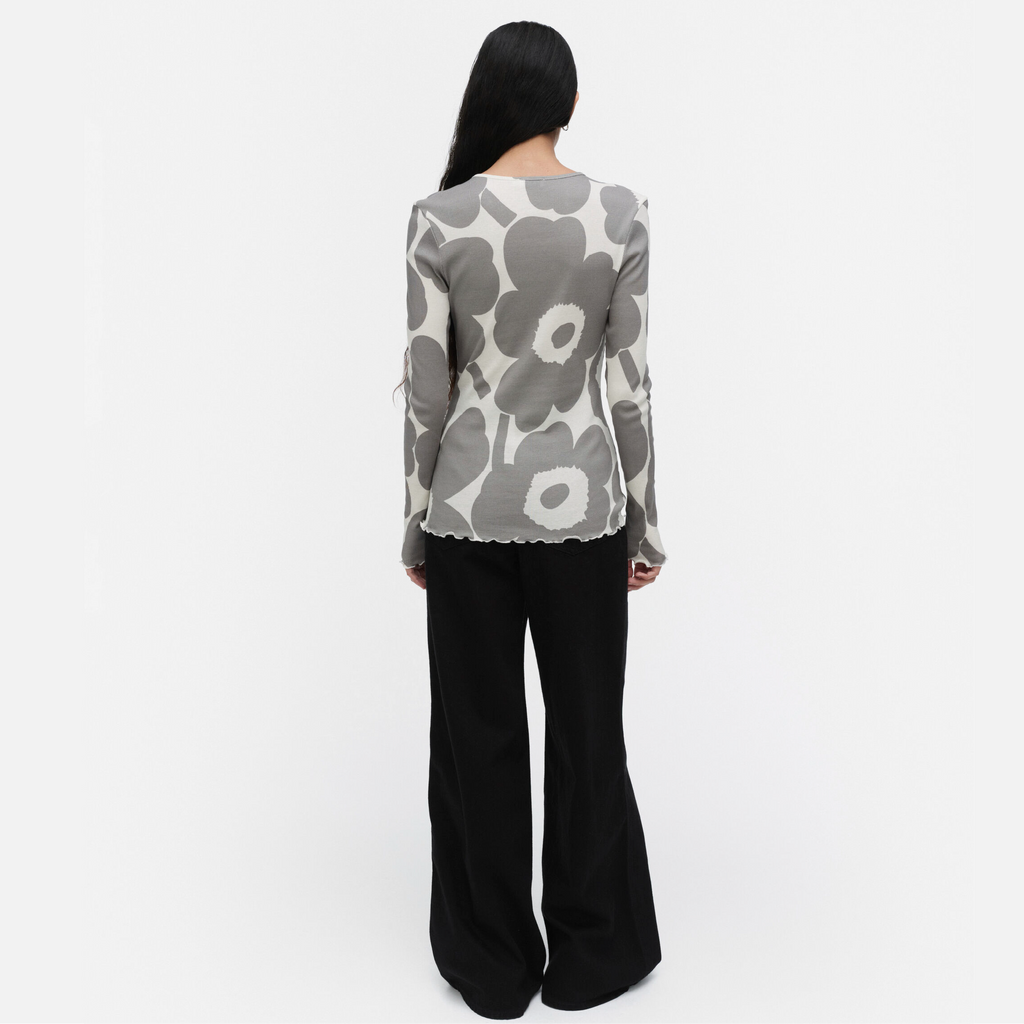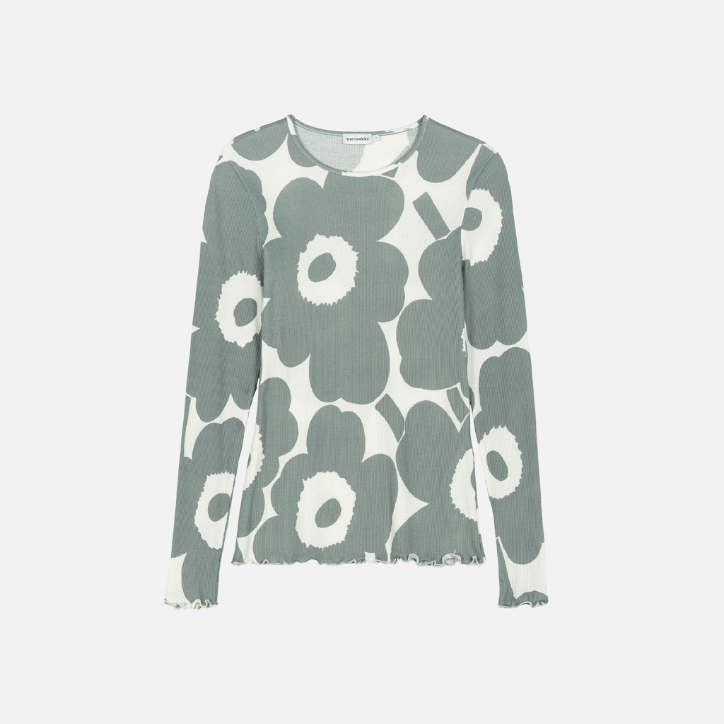 The Floraali rib jersey blouse has a skinny, straight fit and it features the Unikko pattern. The blouse has an O-neck and long skinny sleeves. The sleeve ends and hem are finished with a narrow rolled hem.