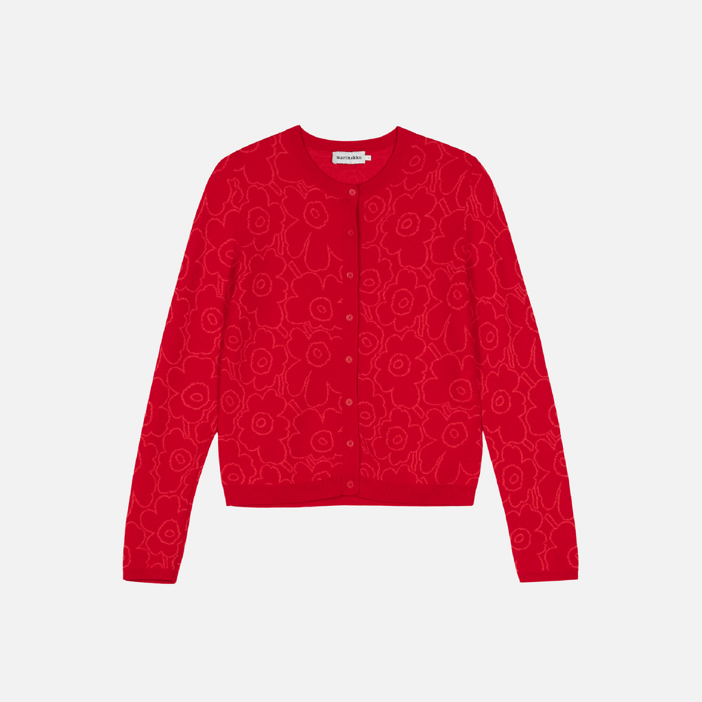 TThe Mutka knitted cardigan is made of merino wool and it has a slim, straight fit. The cardigan features the jacquard knit Mini Piirto Unikko pattern, an O-neck, and a button closure. The sleeve ends and hemline have narrow ribbing.