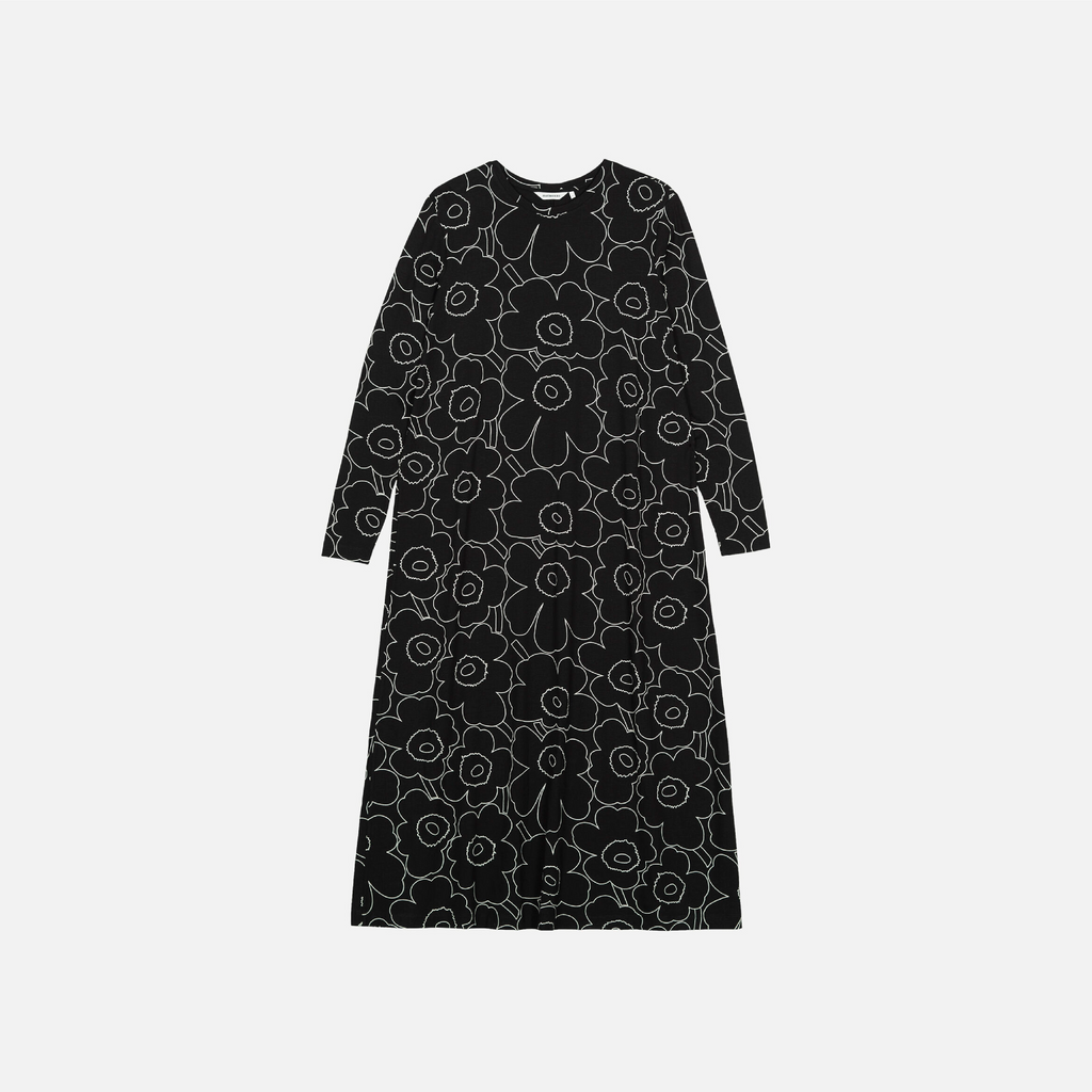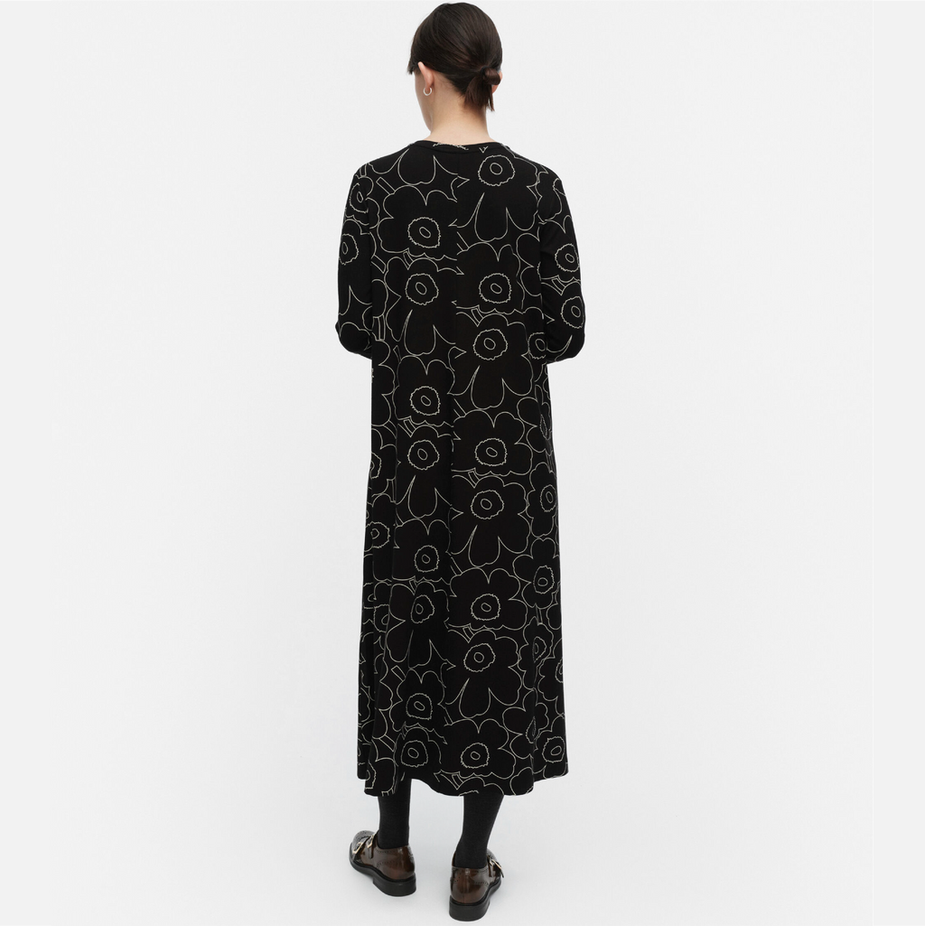 The Kolmin jersey dress has a slim, A-line fit and it features the Piirto Unikko pattern. The dress has an O-neck, long slim sleeves, and a central back seam.