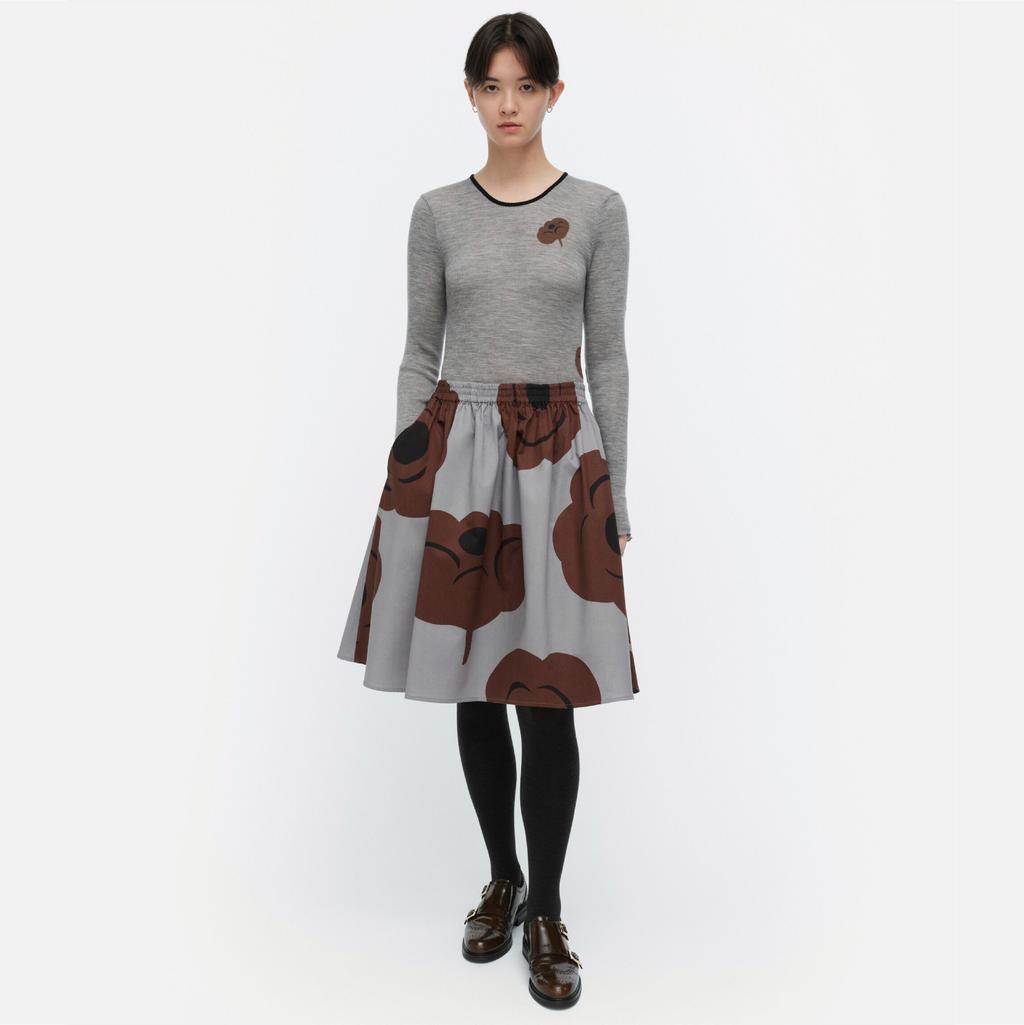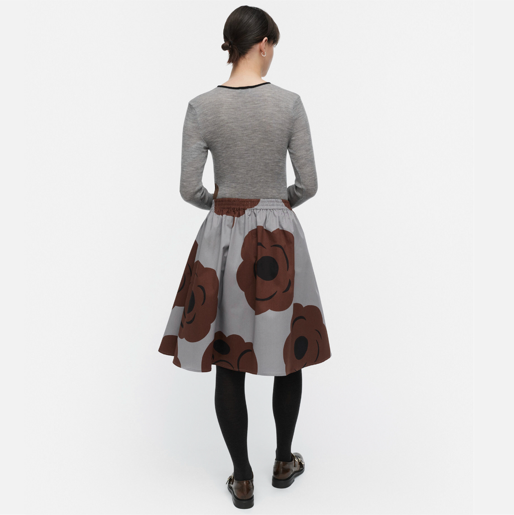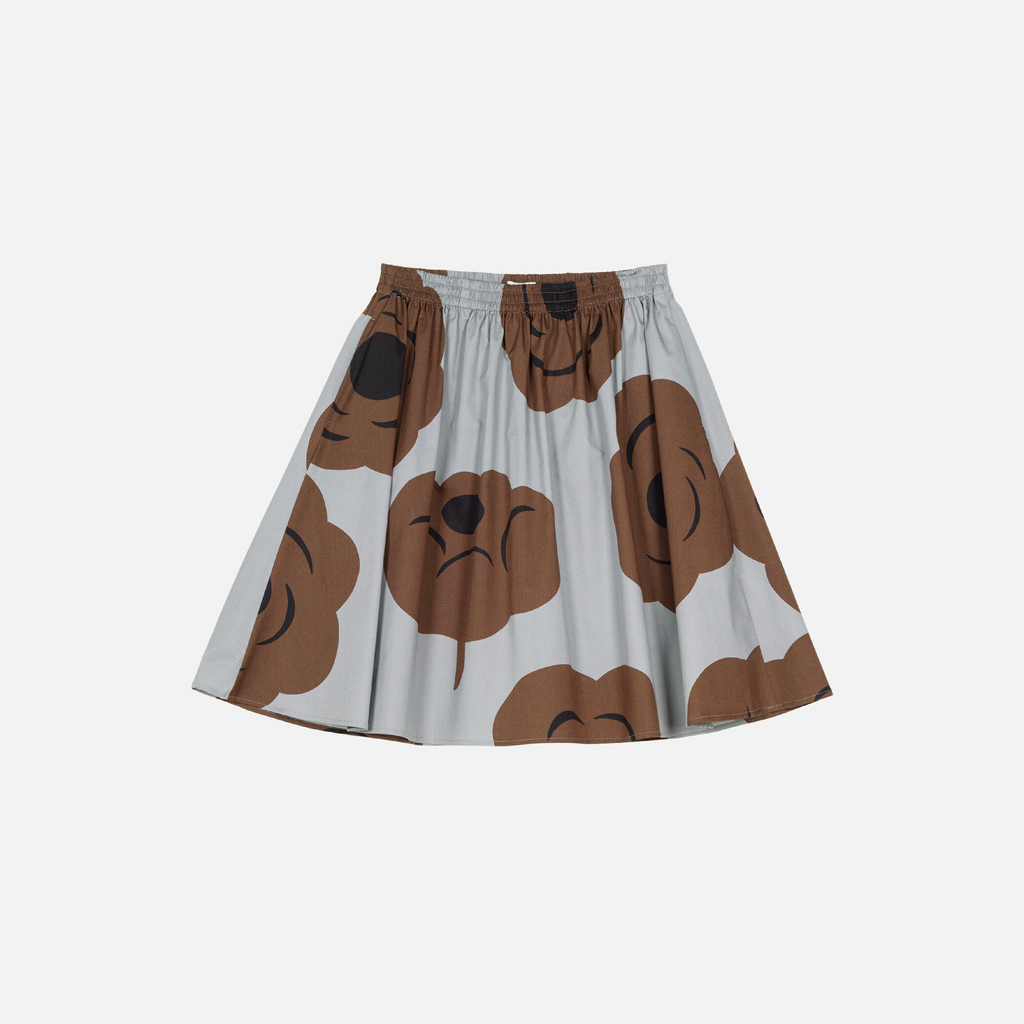 The Poiminnot skirt has a relaxed, A-line fit and it features the Tumma pattern, which is printed in Helsinki. The skirt has a ribbed elastic waistband and side seam pockets.