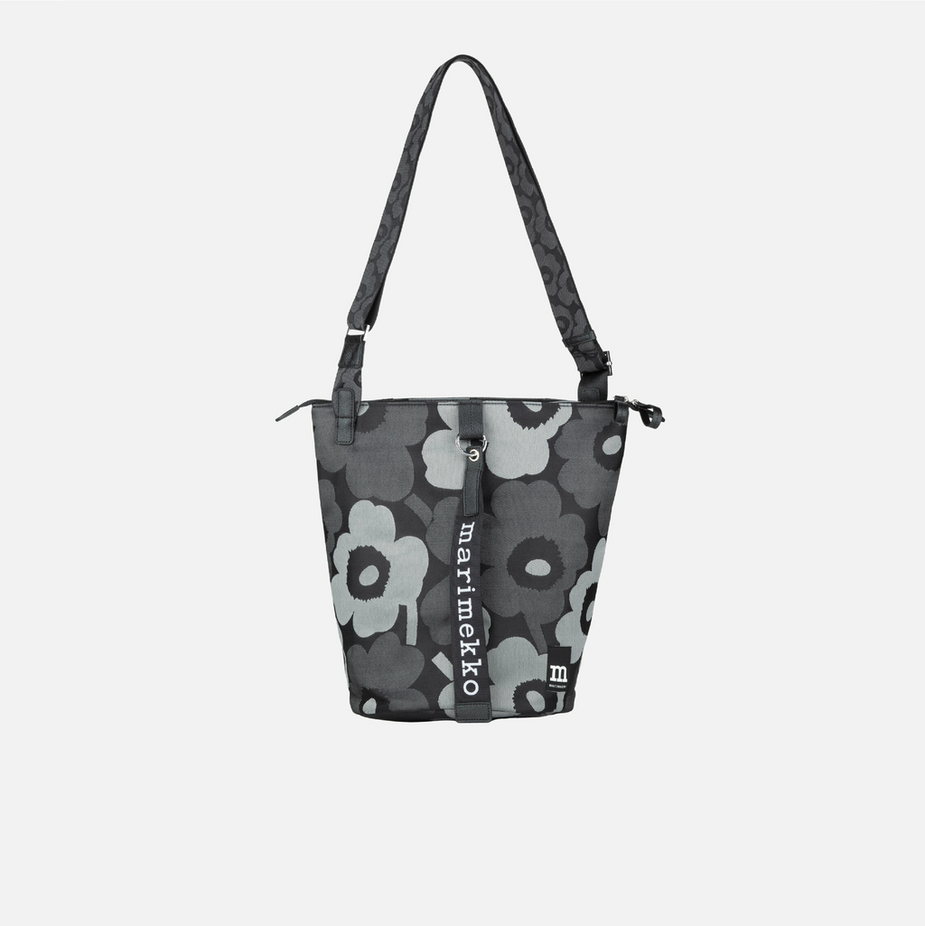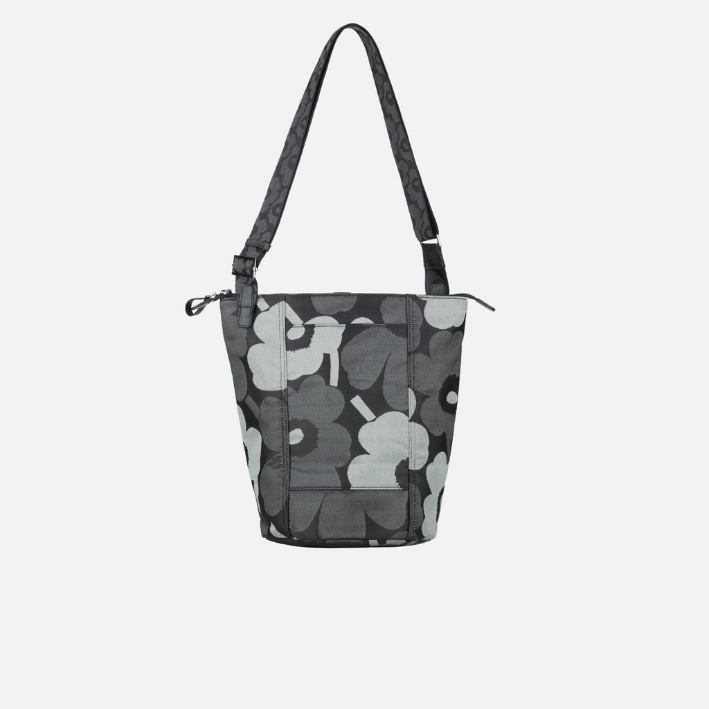 The All Day Bucket shoulder bag is made of nylon. The bag has three compartments: one with a zipper closure, one plain open compartment, and one open compartment with an inside pocket. The adjustable shoulder strap has the jacquard knit Unikko pattern. The front features the Marimekko keychain and there is a slip-in pocket in the back, which closes with a magnetic button. The bag has leather detailing.