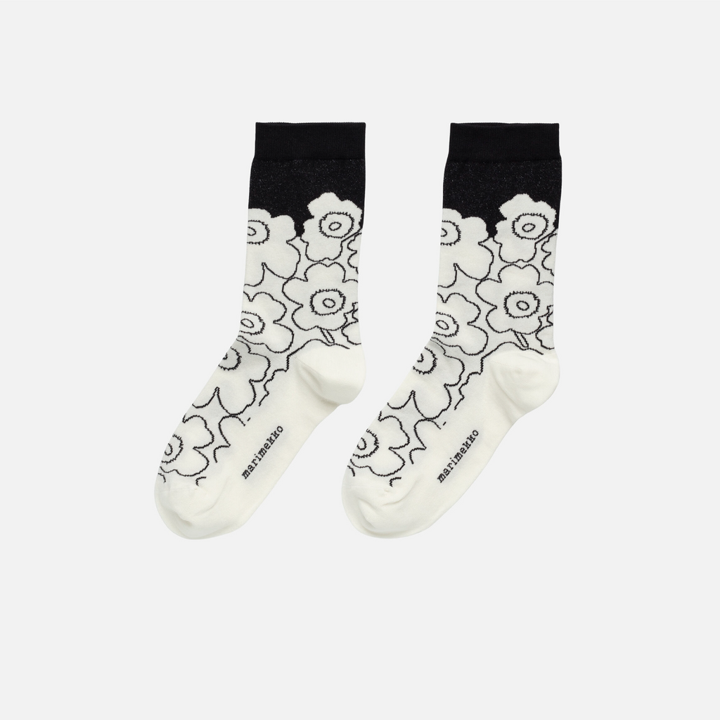 The Linjaus ankle socks are made of a cotton blend, and they feature the Piirto Unikko pattern.