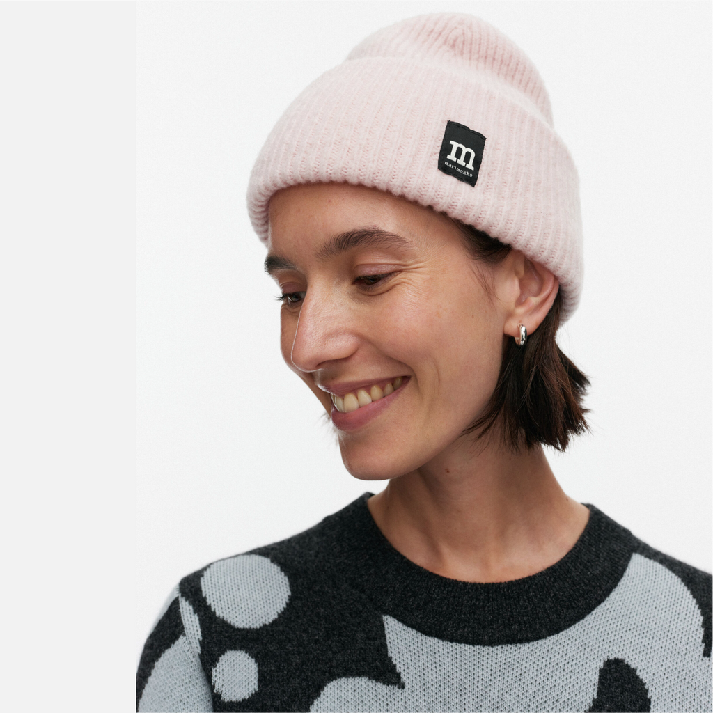 The Pjettar knitted beanie is made of a wool blend. The thick beanie has a hem that is folded over twice and it features the Marimekko label in the front.