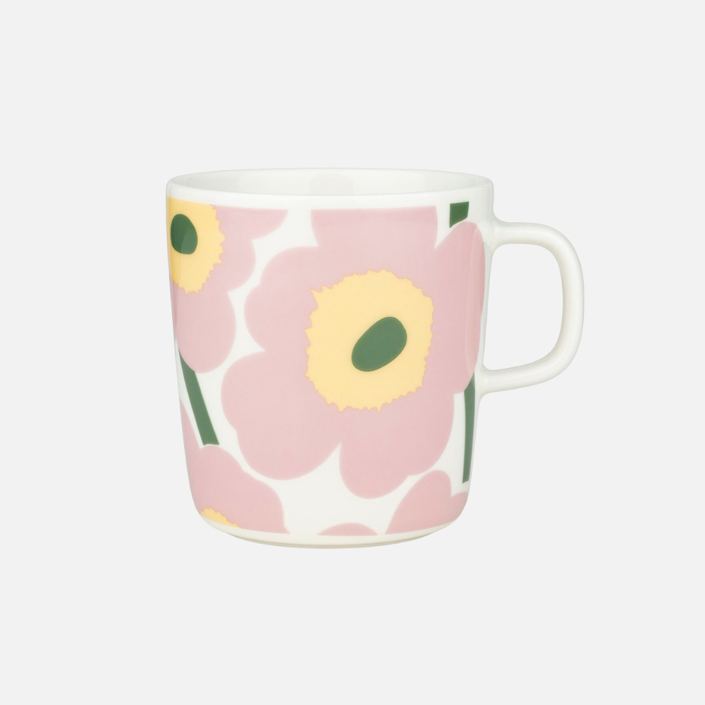 The large Oiva mug with Unikko pattern is made of white stoneware that is dishwasher, oven, microwave and freezer proof.