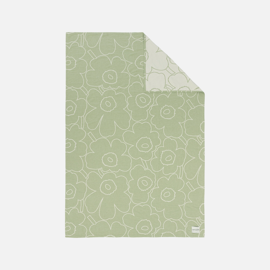 The Piirto Unikko pattern bedspread is made with a jacquard knit. The bedspread is two-sided; one side has a light colored background, while the other side has a darker background.