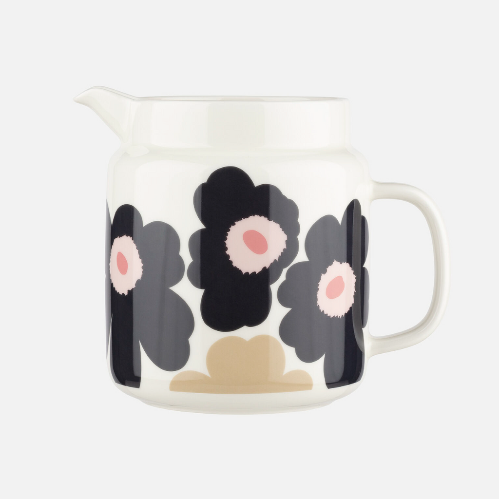 This Oiva jug features the Tiara pattern decal. It is dishwasher safe.