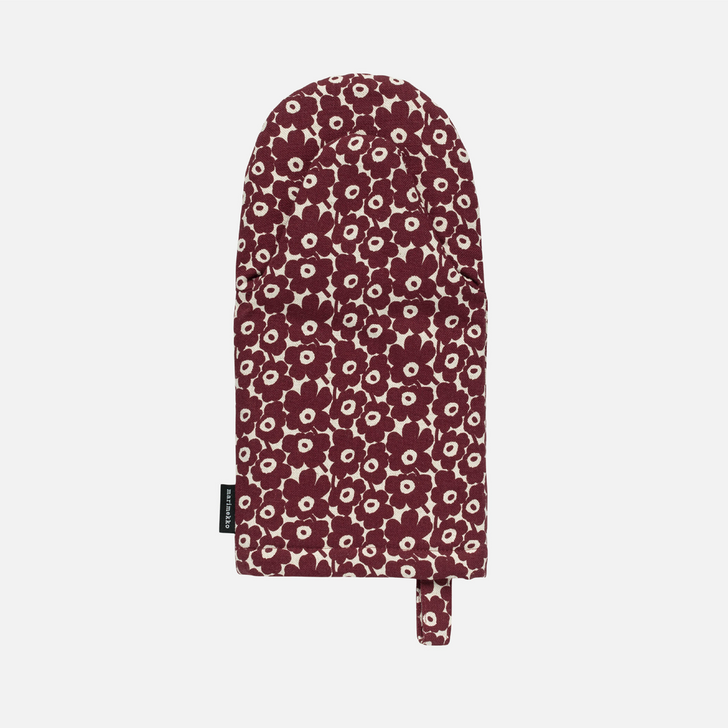 The Pikkuinen Unikko pattern oven mitten is printed in Helsinki. It has a padded filling and a hanging loop.