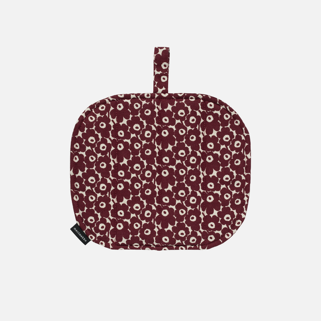 The Pikkuinen Unikko pattern potholder is printed in Helsinki. It has a padded filling and a hanging loop.