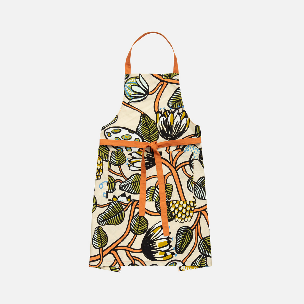 The Tiara pattern apron is printed in Helsinki. It has a front pocket and an adjustable neck band.