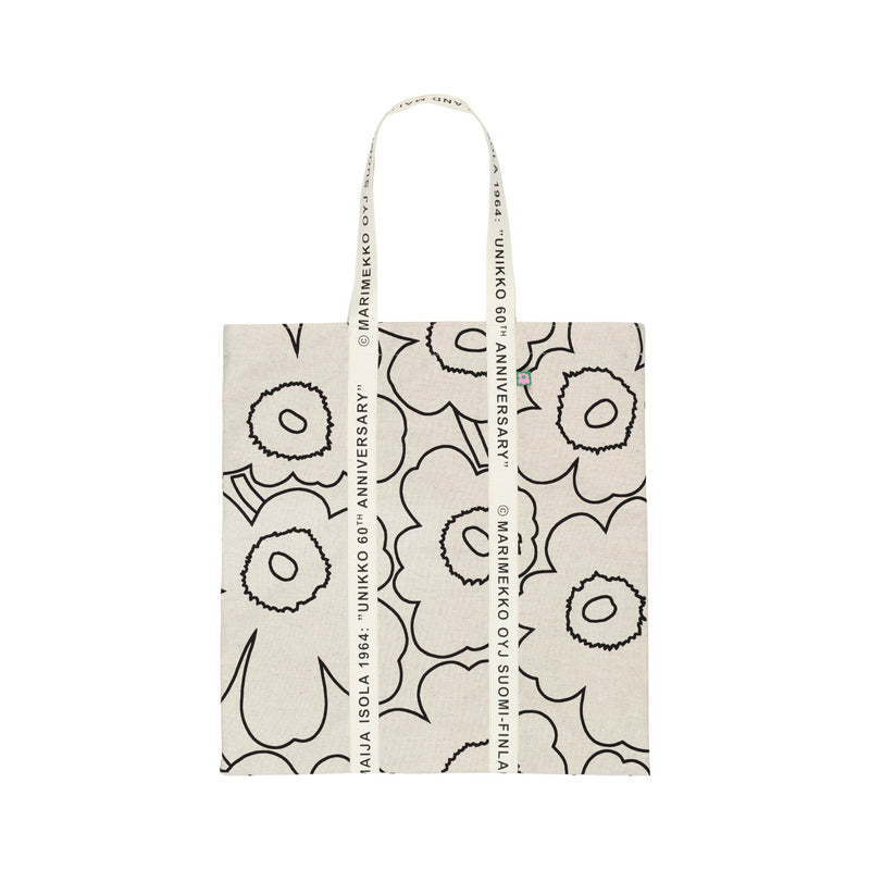 The Carrier Midi tote bag is made of an unbleached cotton and linen blend in the Piirto Unikko pattern, which is printed in Helsinki. The "Marimekko Kioski" printed cotton straps run along the sides of the bag to form the handles.