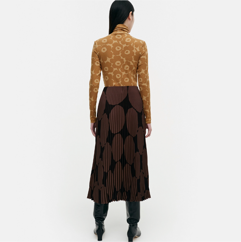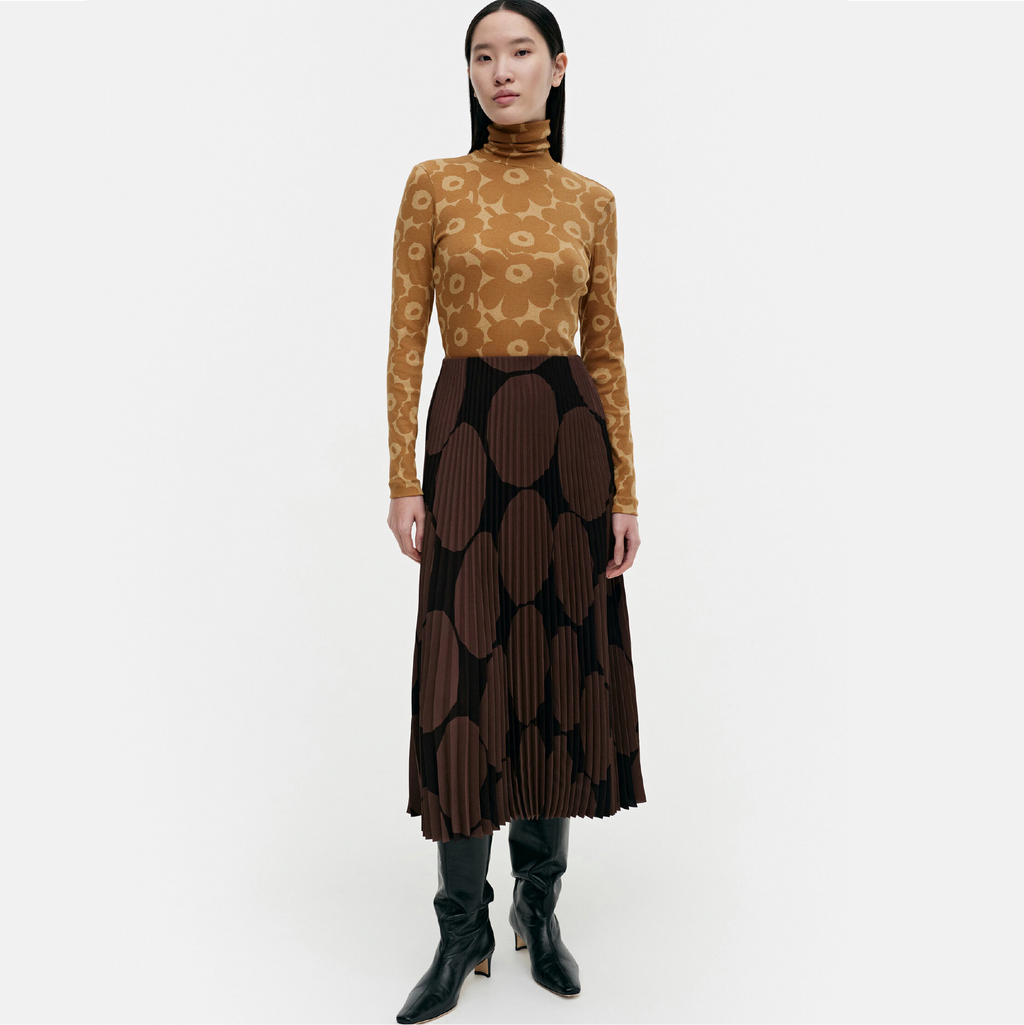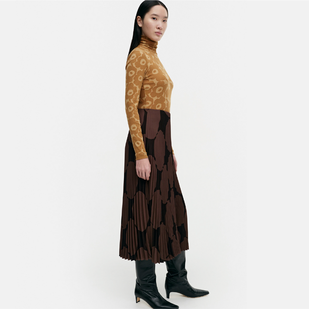 The Kyllikki plissée skirt has an A-line cut and it is made of recycled polyester in the Kivet pattern. The skirt has an elastic waistband.