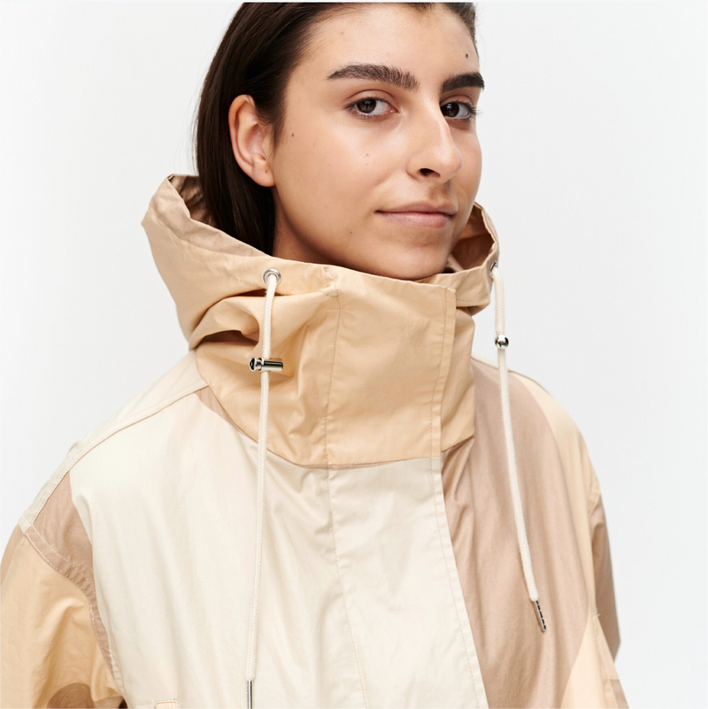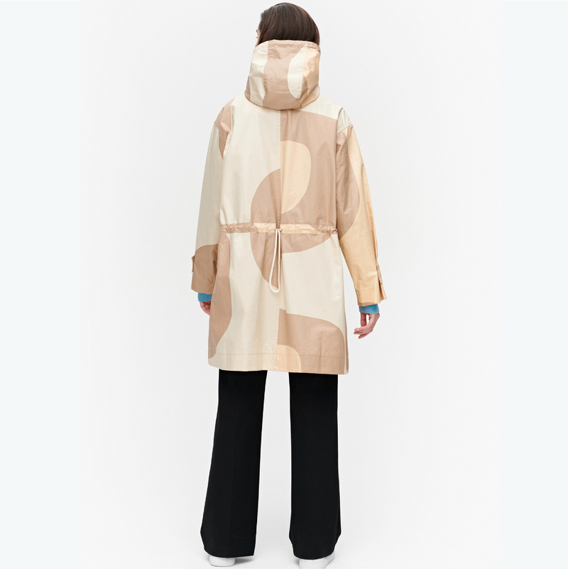 The Taipuisa coat in the Seireeni pattern is made of lightly water repellent cotton. The coat has a fixed drawstring hood, a zipper closure underneath a wide placket, and four exterior pockets: two side chest pockets and two flap pockets at the hip. The waistline can be tightened with drawstrings from the back. The sleeve ends can be tightened with buttoned tabs. The seam allowances on the reverse side of the coat feature Marimekko logo binding.