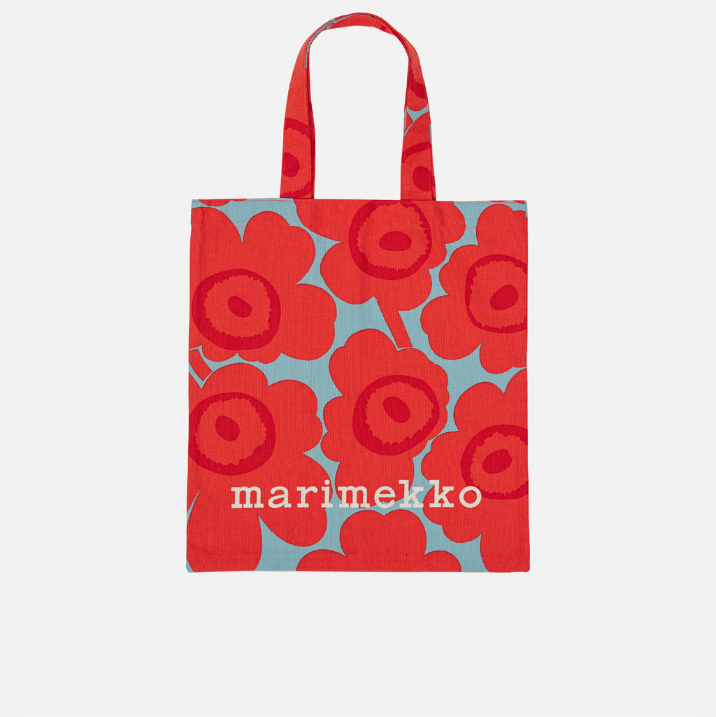 The Vankka tote bag is made of a firm cotton and linen blend, and it features the large Unikko flower and Marimekko logo in the front. The fabric is printed in Helsinki.